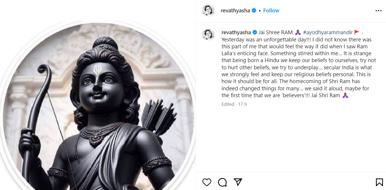 अयोध्या राम मंदिर प्राण प्रतिष्ठा के एक दिन बाद रेवती ने अपने आधिकारिक इंस्टाग्राम अकाउंट पर समारोह को लेकर एक पोस्ट किया। अभिनेत्री ने राम लाल की एक तस्वीर शेयर की और इसके धर्मनिरपेक्ष भारत को लेकर अपनी बात रखी।