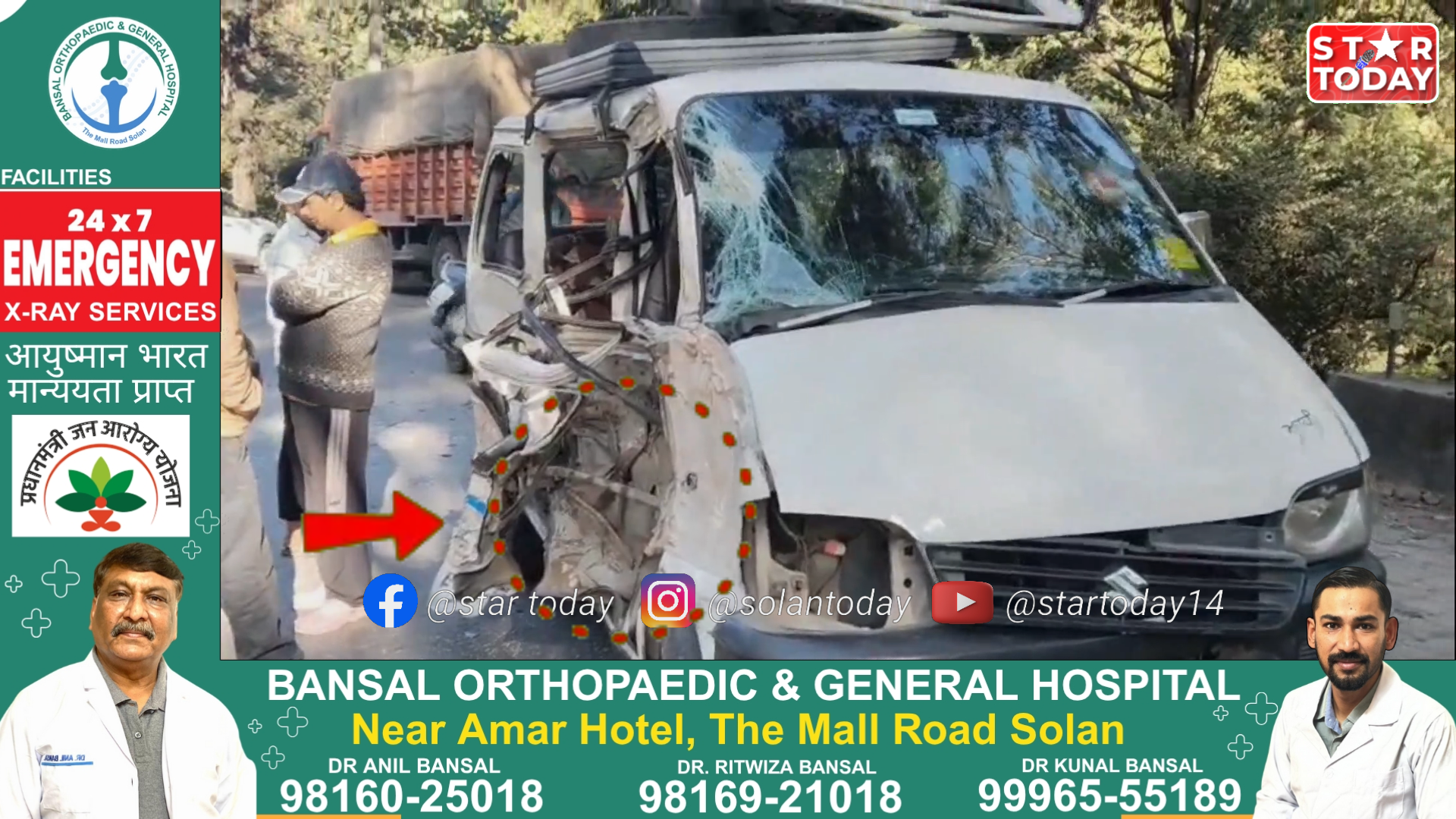 परवाणु में आज सुबह शिवालिक होटल के पास एक दर्दनाक सड़क हादसे में ट्रक और कार की टक्कर हो गई, जिसमें सात लोग घायल हो गए। हादसा इतना भीषण था कि कार के परखच्चे उड़ गए। सूत्रों के अनुसार, टैक्सी कालका से परवाणू सवारियां लेकर आ रही थी, तभी सामने से आ रहे ट्रक से उसकी टक्कर हो गई। चश्मदीदों ने बताया कि ओवरटेक करने के प्रयास में यह हादसा हुआ। घटना के बाद मौके पर अफरा-तफरी मच गई। स्थानीय लोगों ने तुरंत घायलों को अस्पताल पहुंचाया। दो गंभीर रूप से घायल यात्रियों को पीजीआई चंडीगढ़ रेफर किया गया है, जबकि पांच अन्य का इलाज परवाणू के ई.एस.आई अस्पताल में चल रहा है। सूचना मिलते ही पुलिस मौके पर पहुंची और दोनों वाहनों को कब्जे में लेकर दुर्घटना के कारणों की जांच शुरू कर दी है। स्थानीय लोगों ने बताया कि यह इलाका ओवरटेकिंग के लिए बेहद खतरनाक माना जाता है और यहां पहले भी कई हादसे हो चुके हैं। पुलिस ने लोगों से अपील की है कि वे इस मार्ग पर वाहन चलाते समय रफ्तार पर नियंत्रण रखें और ट्रैफिक नियमों का पालन करें।