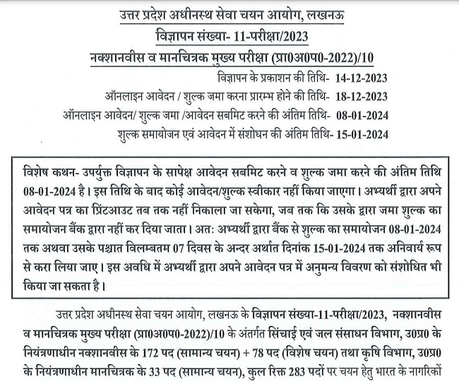 जॉब डेस्क, नई दिल्ली। उत्तर प्रदेश में सरकारी नौकरी के इच्छुक उम्मीदवारों के लिए महत्वपूर्ण अलर्ट। उत्तर प्रदेश सरकार के सिंचाई एवं जल संसाधन विभाग में नक्शानवीस के 250 पदों तथा कृषि विभाग में मानचित्रक के 33 पदों समेत कुल 283 पदों पर भर्ती के लिए आवेदन आमंत्रित किए जा रहे हैं। उत्तर प्रदेश अधीनस्थ सेवा चयन आयोग (UPSSSC) द्वारा आयोजित की जा रही इस भर्ती (UPSSSC Recruitment 2024) के लिए आवेदन प्रक्रिया 18 दिसंबर 2023 से चल रही है। यह आवेदन प्रक्रिया आज यानी सोमवार, 8 जनवरी 2024 को समाप्त हो जाएगी।